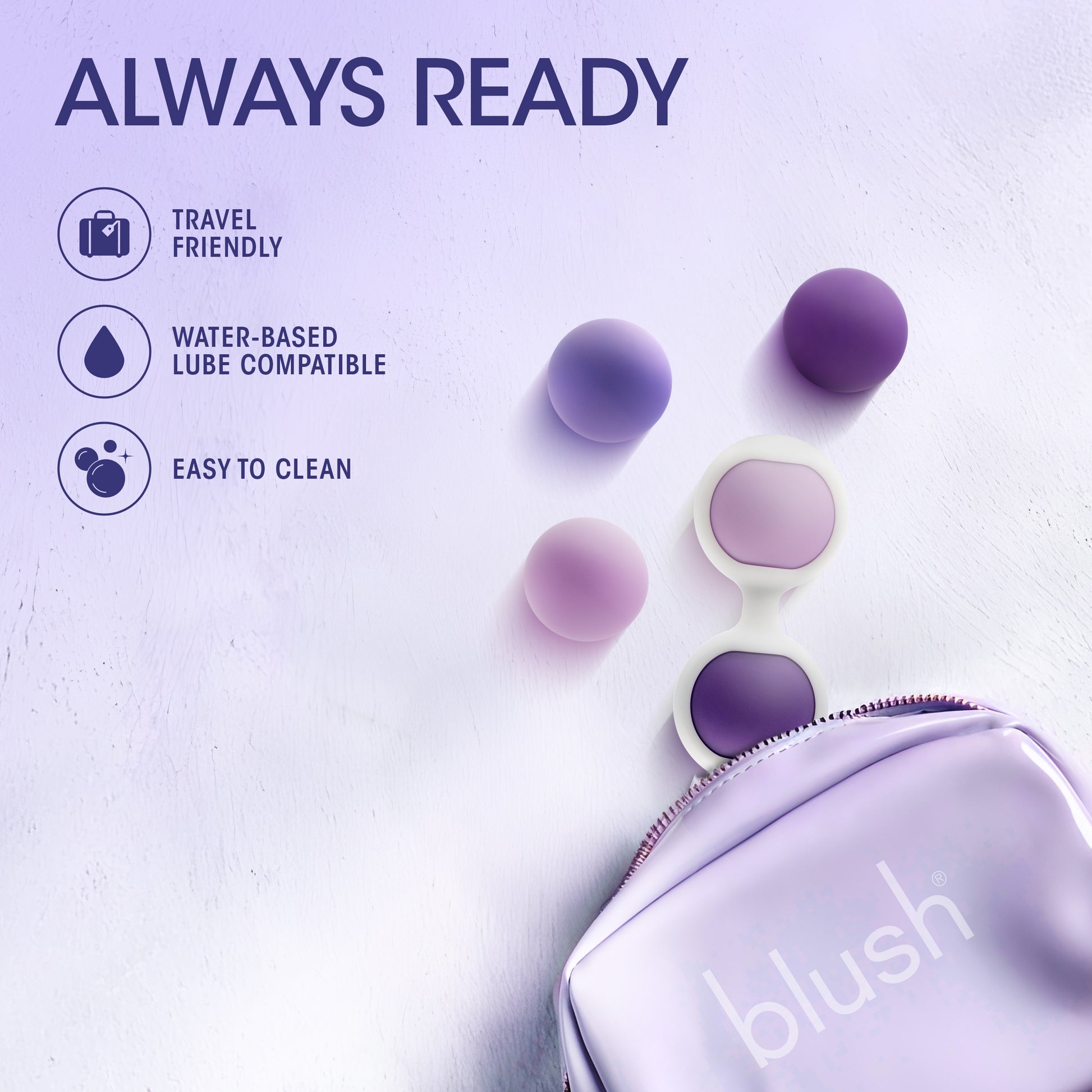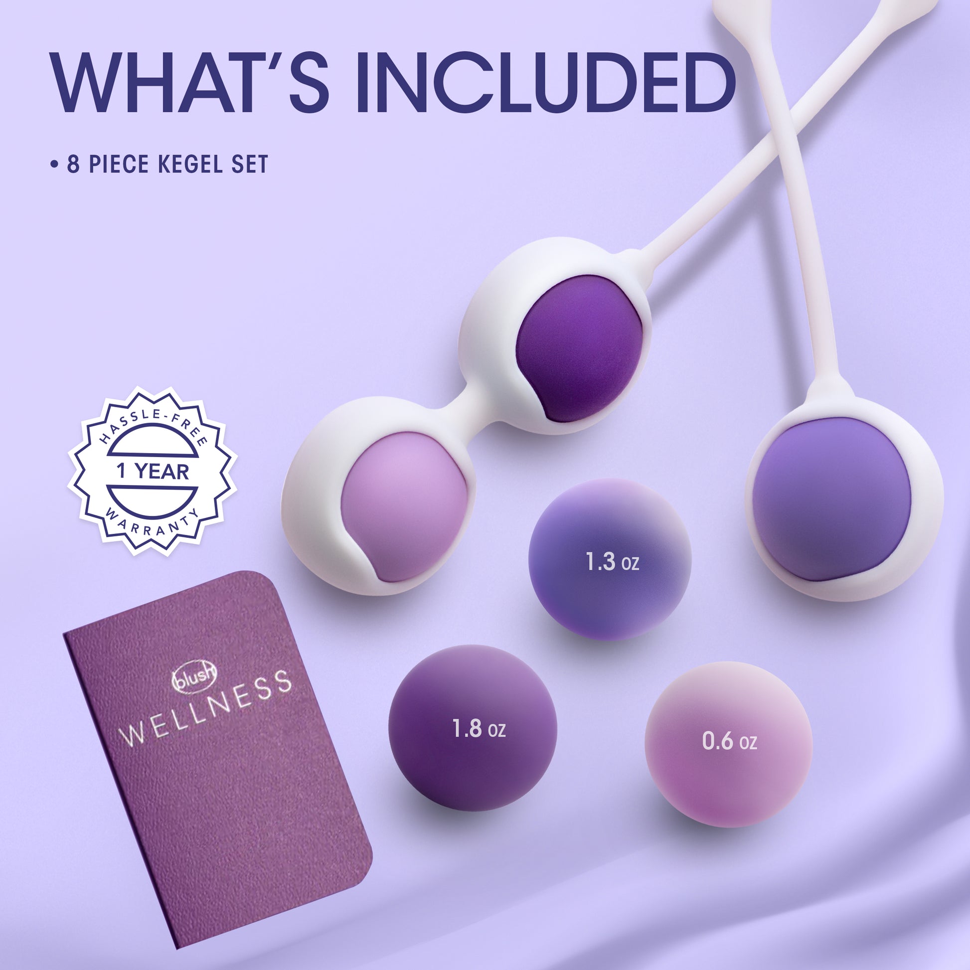 The Wellness Kegel Training Kit delivers a fully customized strengthening routine. This complete set includes six balls, progressively weighted in pairs from 0.6 ounces to 1.8 ounces. The satin smooth silicone balls can be used alone or in pairs, for a total of nine possible weight combinations.