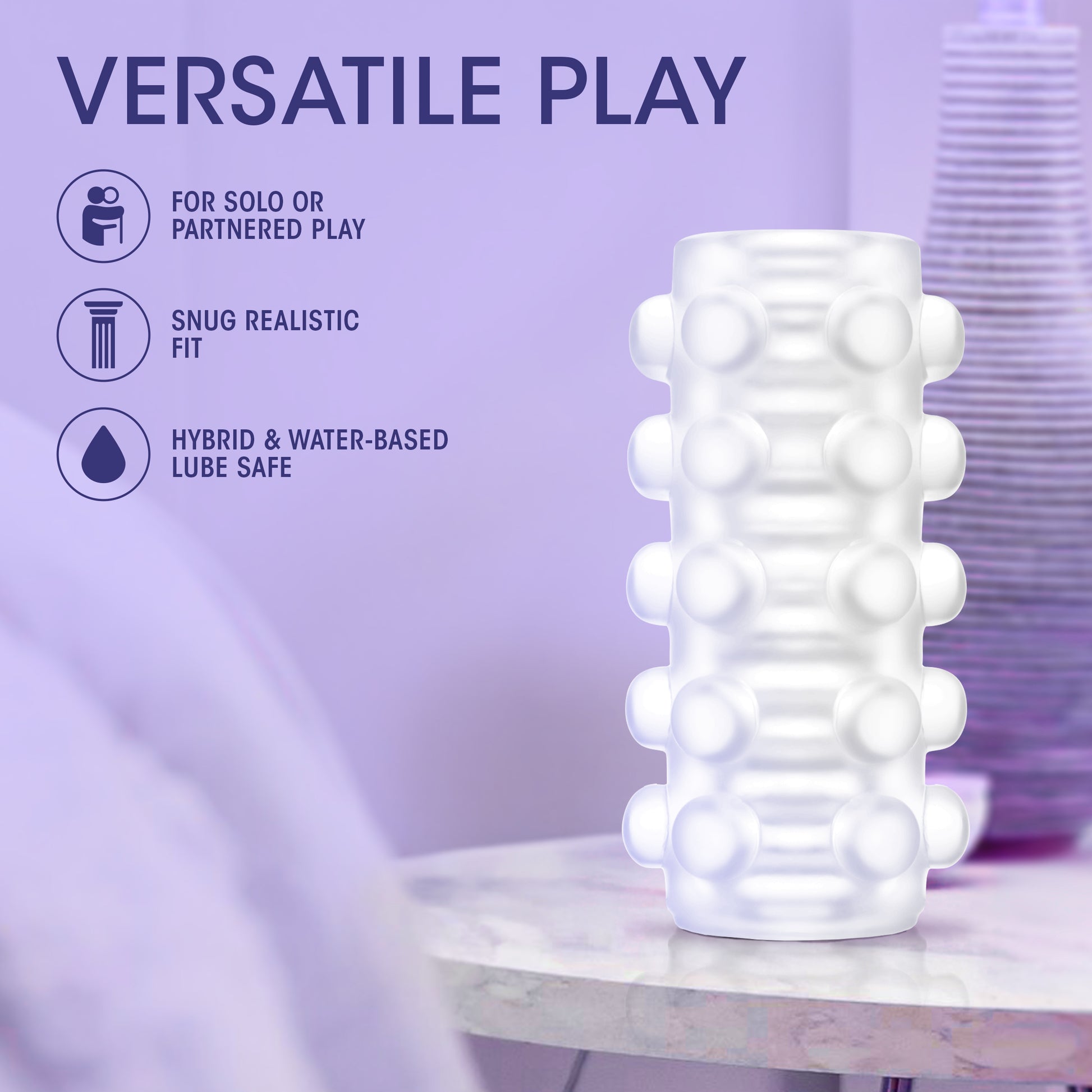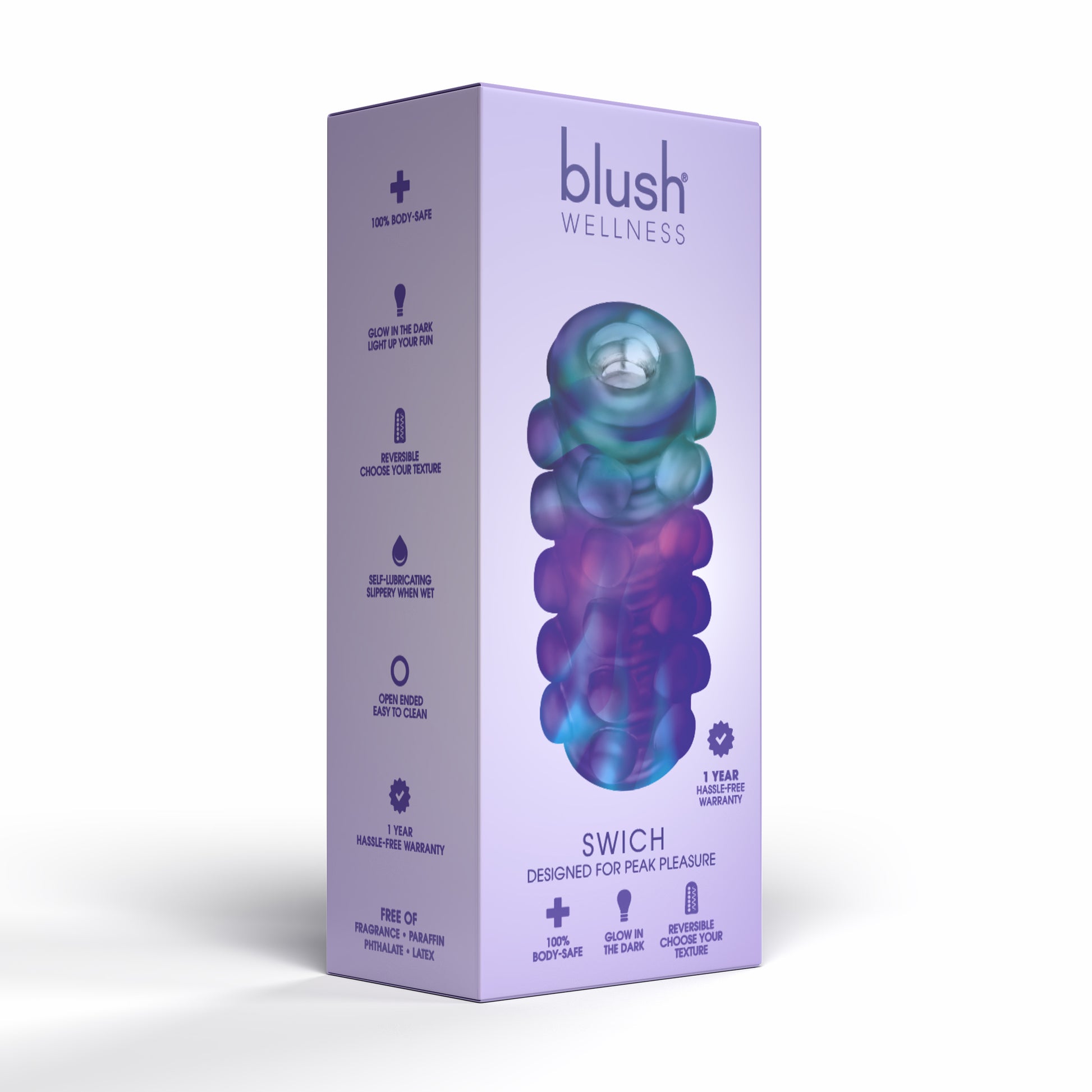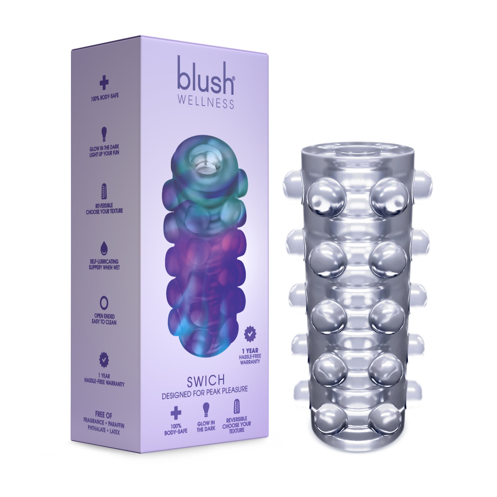 Swich is double-sided and reversible: choose between ribs for sensational stroking or pressure point massage. Super-soft and flexible, easy to clean, it fits most shaft sizes and is free of phthalates, fragrances, paraffins, and latex.